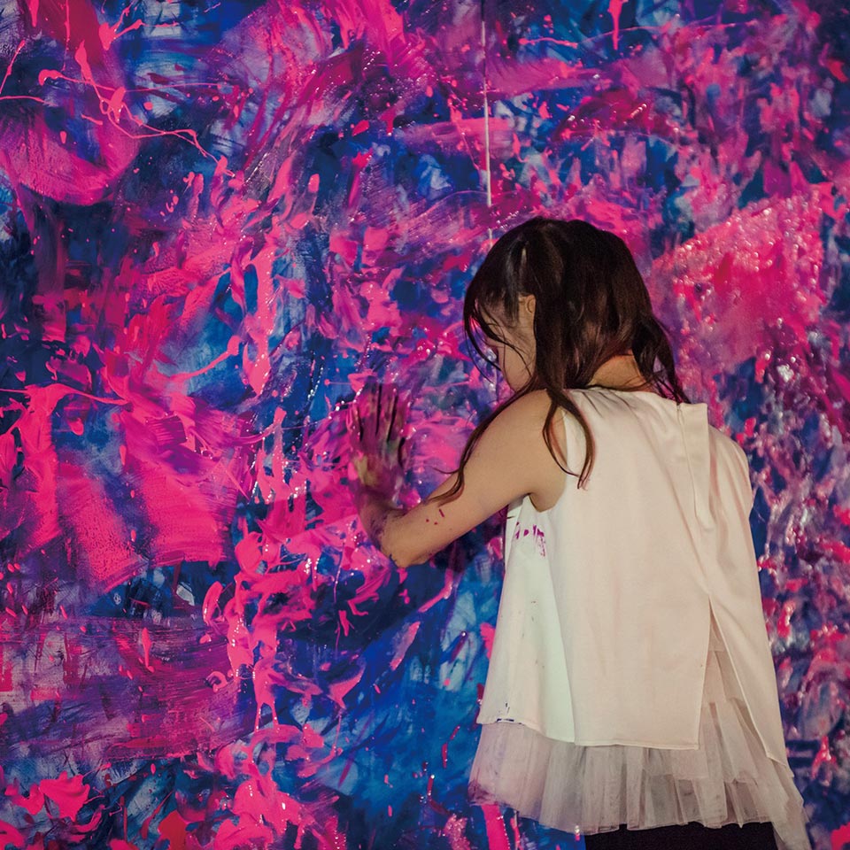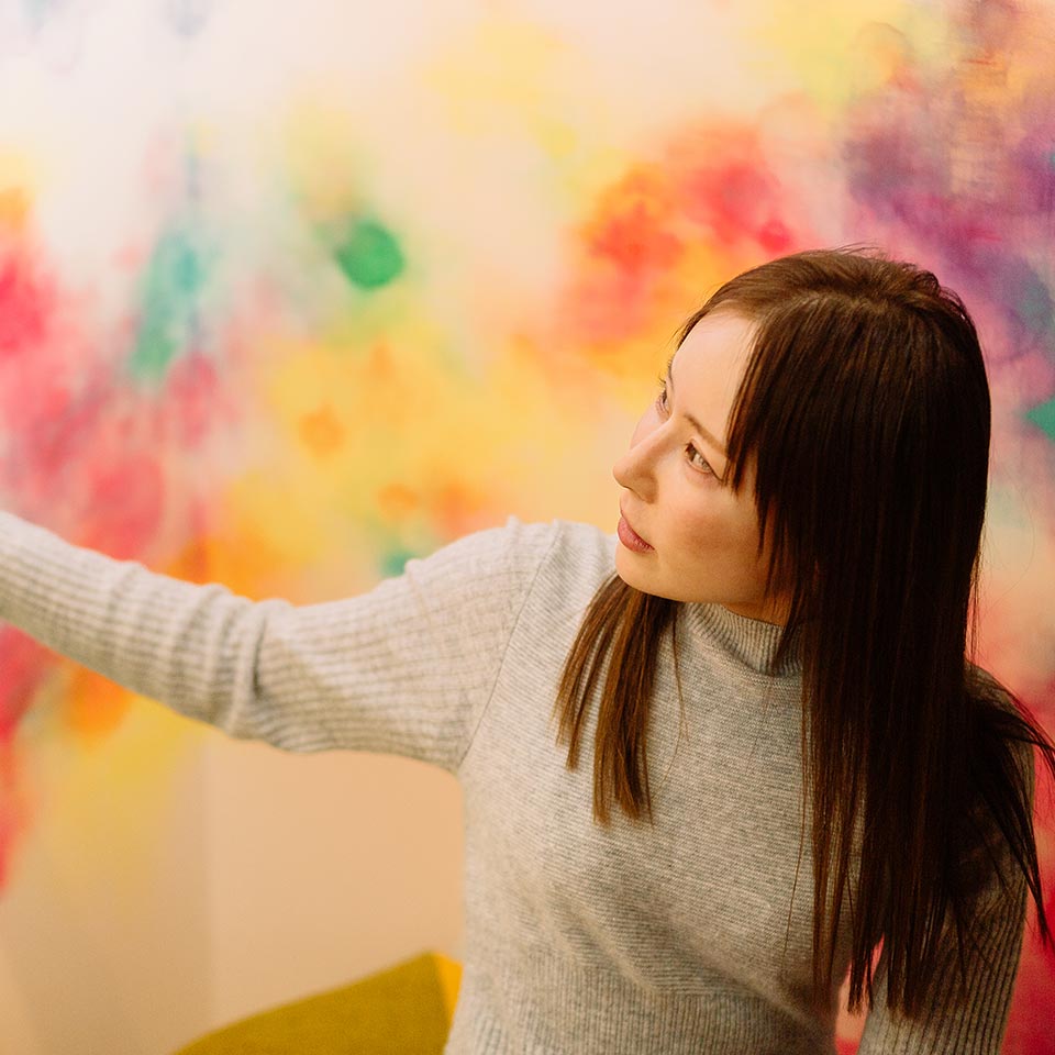 昨年行われた別所温泉芸術祭。ライブペイントは、真っ白なキャンパスから一つの作品が完成する工程を目の前で体験できるところに面白さがあると思っています。絵の具をどうのせていくかは決めていなくて、音楽やその時々で変わっていきます。まさに秒刻みの戦いです。だから私が作品を目にするのは、描き終えて観客の皆さんにご挨拶して、振り返った時が初めてなんです。「おぉ、こうなったか」と自分でも驚く瞬間ですね。