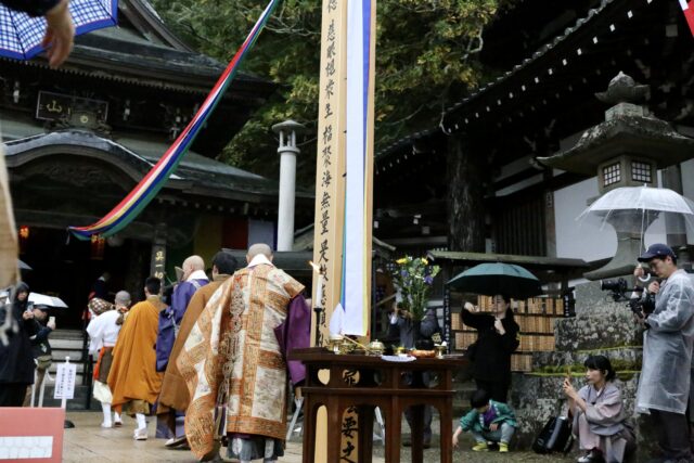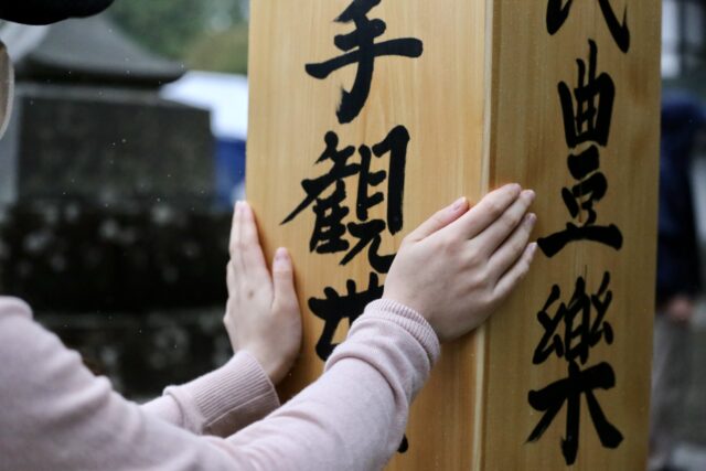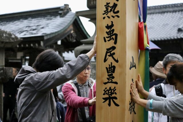 「回向柱」では、皆さまが柱に手を触れ、願いを祈る姿が印象的です。
