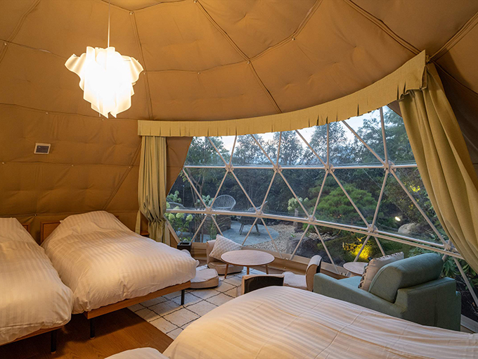 各客室は「桜」「椿」「紫陽花」など植物の名前が付けられております。窓の外に広がる庭園には、部屋名にちなんだ花や木をお楽しみいただけます。客室は総部屋数11室 洋室が4つのタイプで10室、グランピングが1室。別所温泉では珍しいベッド数3台、4台のお部屋もございます。